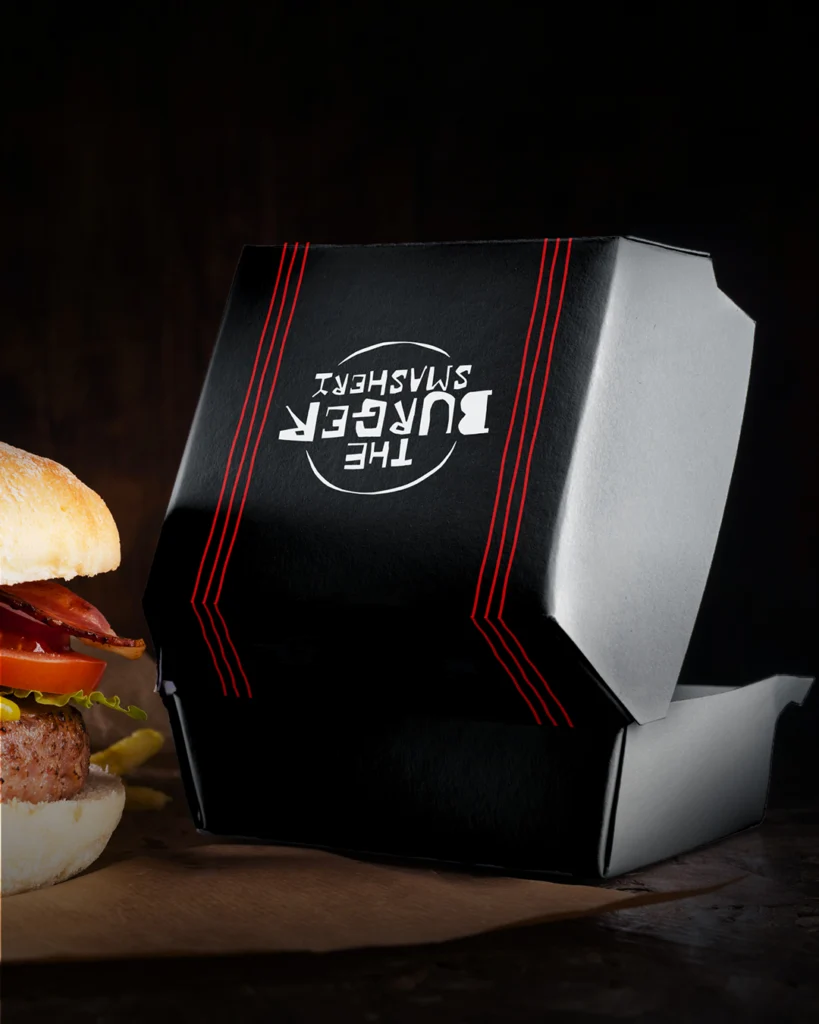 Markenerlebnis hört nicht an der Ladentheke auf. Die Burger-Verpackung transportiert den Charakter der Smashery direkt zum Kunden.